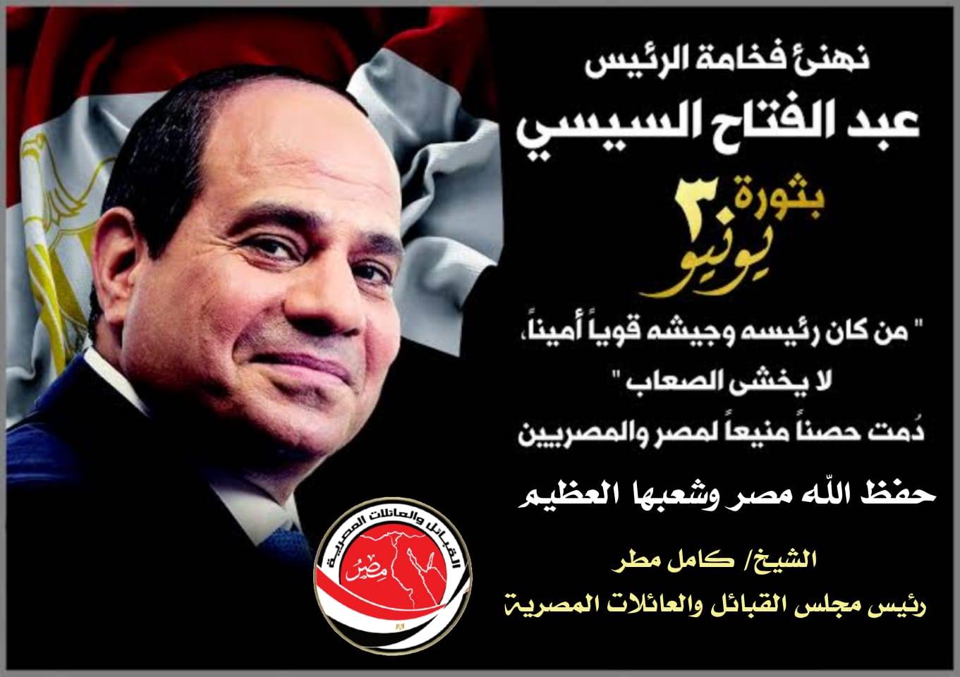 بعث الشيخ كامل مطر - رئيس مجلس القبائل والعائلات المصرية برقية تهنئة إلى الرئيس عبد الفتاح السيسي رئيس الجمهورية، ورئيس مجلس الوزراء الدكتور مصطفى مدبولي بمناسبة احتفالات مصر بذكرى ثورة 30 يونيو .