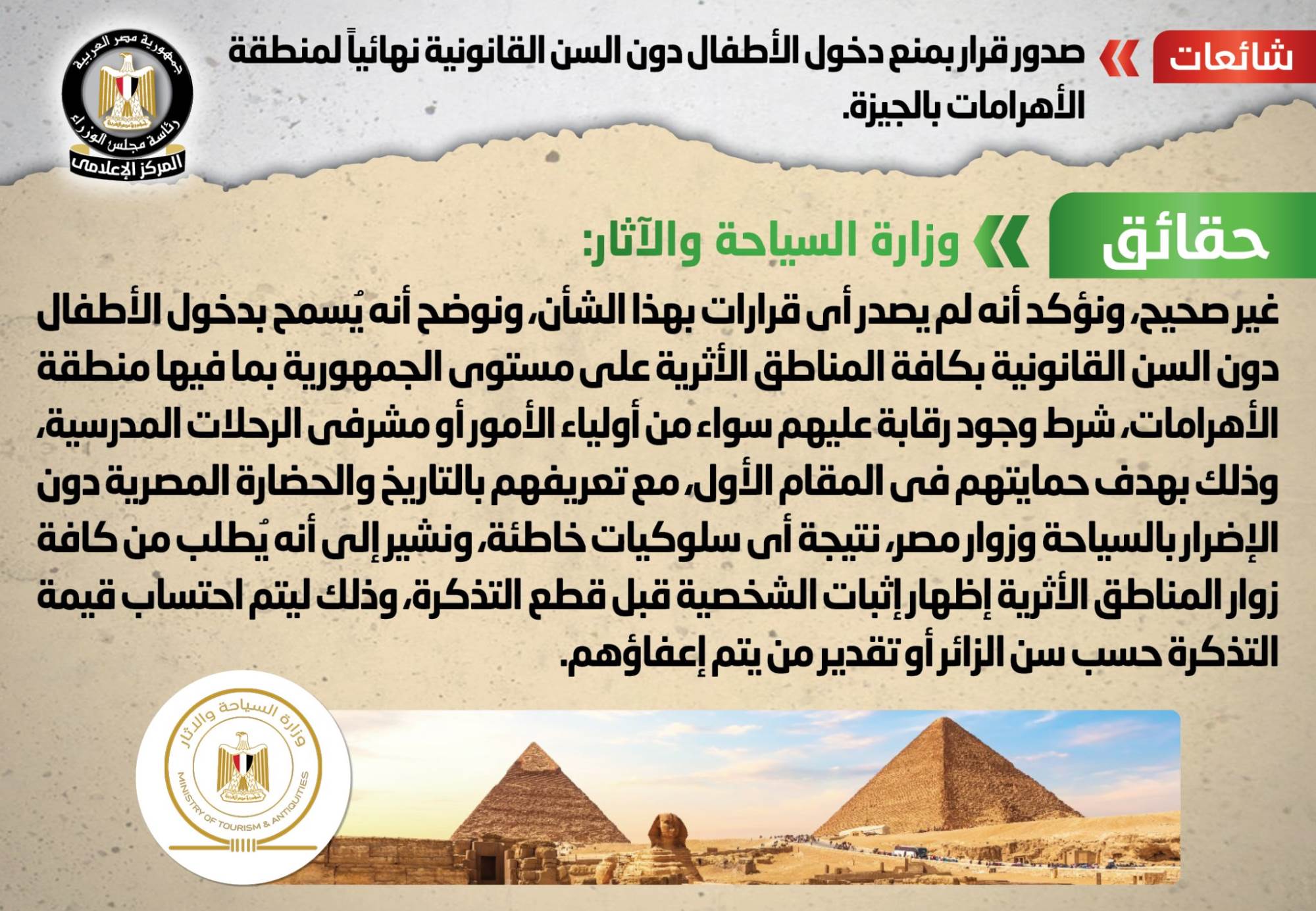 وقام المركز الإعلامي لمجلس الوزراء، بالتواصل مع وزارة السياحة والآثار، والتي نفت تلك الأنباء، مُؤكدةً أنه لا صحة لصدور قرار بمنع دخول الأطفال دون السن القانوني نهائياً لمنطقة الأهرامات بالجيزة، مؤكدةً أنه لم يصدر أي قرارات بهذا الشأن، مُوضحةً أنه يُسمح بدخول الأطفال دون السن القانونية بكافة المناطق الأثرية على مستوى الجمهورية بما فيها منطقة الأهرامات، شرط وجود رقابة عليهم سواء من أولياء الأمور أو مشرفي الرحلات المدرسية، وذلك بهدف حمايتهم في المقام الأول، مع تعريفهم بالتاريخ والحضارة المصرية دون الإضرار بالسياحة وزوار مصر، نتيجة أي سلوكيات خاطئة، مُشيرةً إلى أنه يُطلب من كافة زوار المناطق الأثرية إظهار إثبات الشخصية قبل قطع التذكرة، وذلك ليتم احتساب قيمة التذكرة حسب سن الزائر أو تقدير من يتم إعفاؤهم.