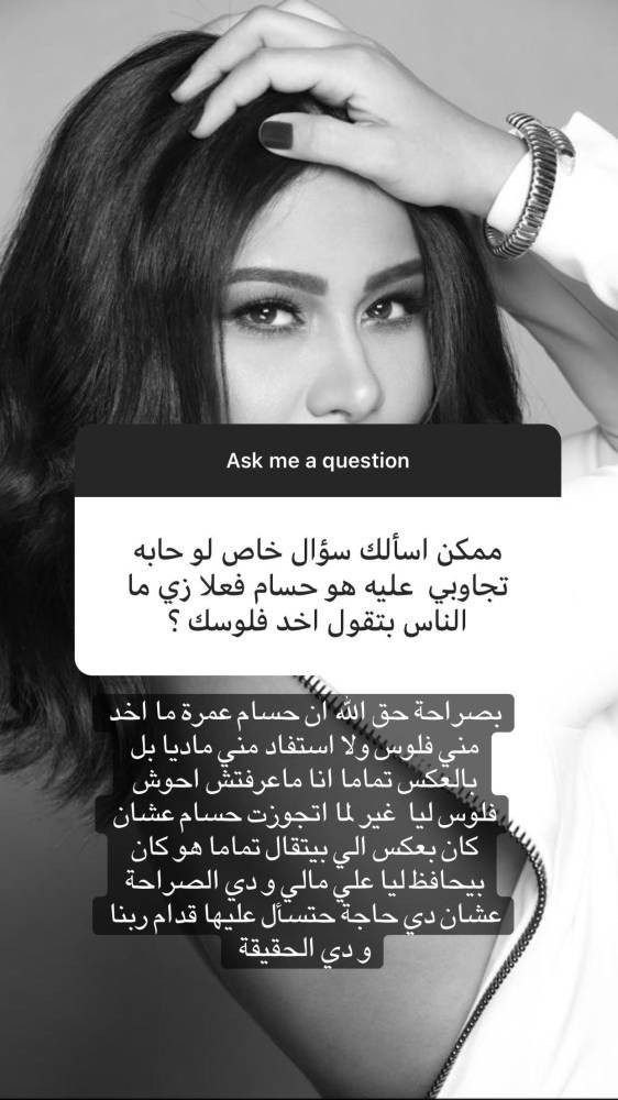 وأضافت: “ولا استفاد مني ماديا، بل بالعكس تماما أنا معرفتش أحوش فلوس ليا غير لما اتجوزت حسام.. بعكس اللي بيتقال تماما هو كان بيحافظ ليا على مالي ودي الصراحة”.