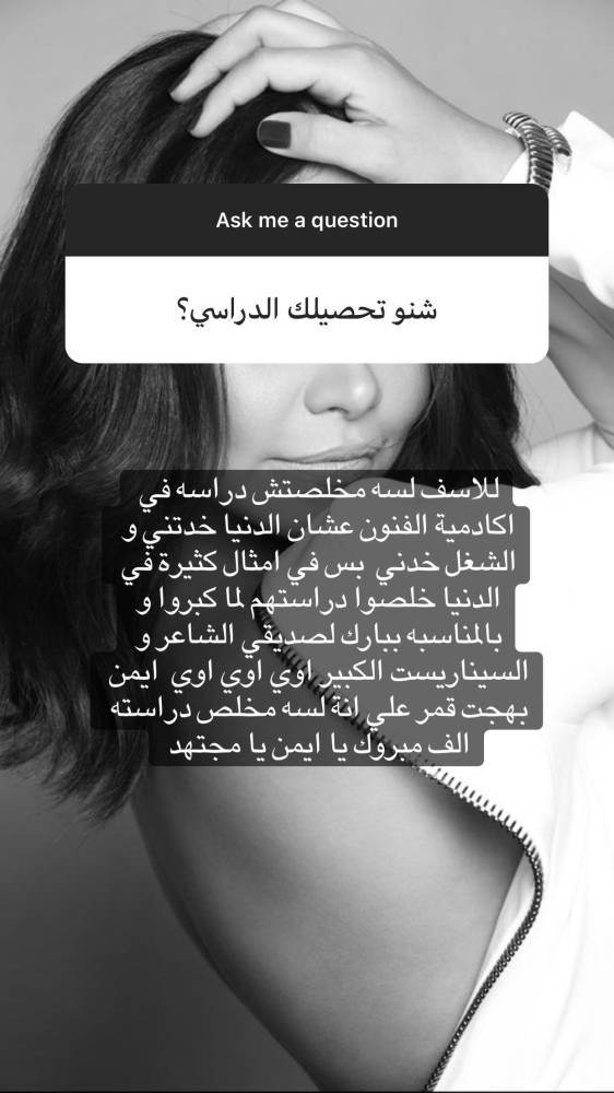 وتابعت: “علشان دي حاجة هتسأل عليها قدام ربنا ودي الحقيقة”، وأجابت أيضًا على سؤال أحد المتابعين “ما هو تحصيلها الدراسي” وكتبت عبر خاصية الستوري التابعة لصفحتها الرسمية بموقع التواصل الاجتماعي لتبادل الصور والفيديوهات انستجرام: “للأسف لسه مخلصتش دراسة في أكاديمية الفنون.. عشان الدنيا خدتني والشغل خدني”.