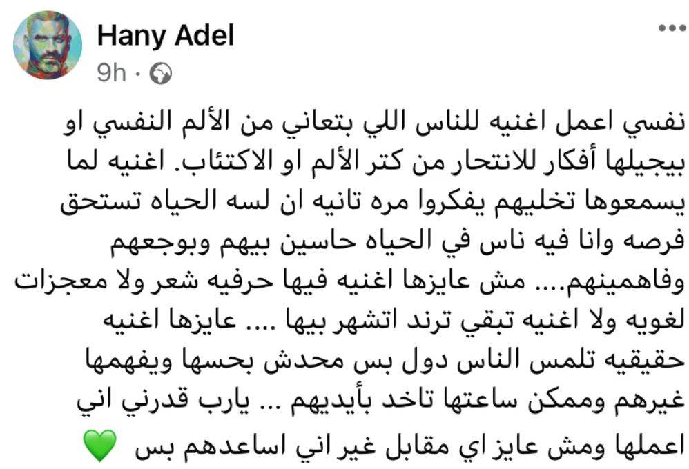 وتابع الفنان هاني عادل قائلًا: “عايزها اغنية حقيقية تلمس الناس دول بس محدش بحسها ويفهمها غيرهم وممكن ساعتها تاخد بأيديهم ... يارب قدرني إني أعملها ومش عايز اي مقابل غير إني أساعدهم بس”.