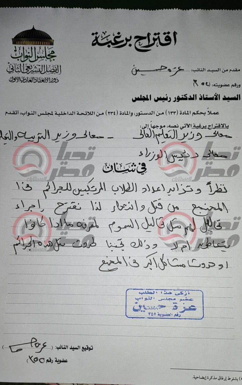 وطالبت عضو مجلس النواب فى الطلب المقدم منها، باجراء تحليل لهم مثل تحليل السموم لمعرفة، مضيفة” ما اذا كانو يتعاطون أم لا، وذلك تجنبا لحدوث مثل هذه الجرائم أو حدوث مشاكل أكبر فى المجتمع “.