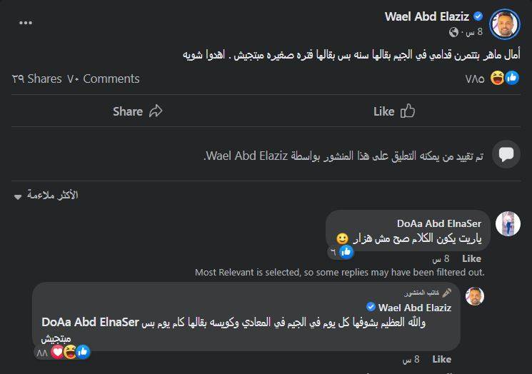 وكتب وائل محمود عبد العزيز عبر حسابه الرسمي بموقع التواصل الإجتماعي فيسبوك: بتتمرن قدامي في الجيم بقالها سنه بس بقالها فتره صغيره مبتجيش، اهدوا شويه.
