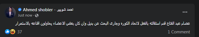 وكتب شوبير عبر حسابة الرسمي"فيس بوك:" عصام عبد الفتاح قدم استقالته بالفعل لاتحاد الكرة وجارى البحث عن بديل وان كان بعض الاعضاء يحاولون اقناعه بالاستمرار.