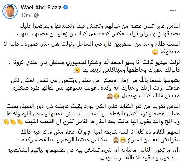 كتب وائل عبد العزيز في منشور جديد عبر صفحته الرسمية بموقع التواصل الاجتماعي فيسبوك: “الناس عايزا تبني قصه من خيالهم وتعيش فيها وتصدقها ويفرضوا عليك تصدقها زايهم ولو قولت عكس كده تبقي كداب ويزعلوا ان قصتهم انتهت”.