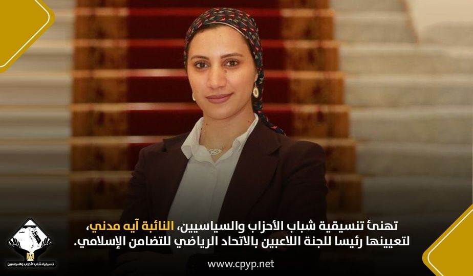 هنأت تنسيقية شباب الأحزاب والسياسيين، النائبة آيه مدني، لتعيينها رئيسا للجنة اللاعبين بالاتحاد الرياضي للتضامن الإسلامي.