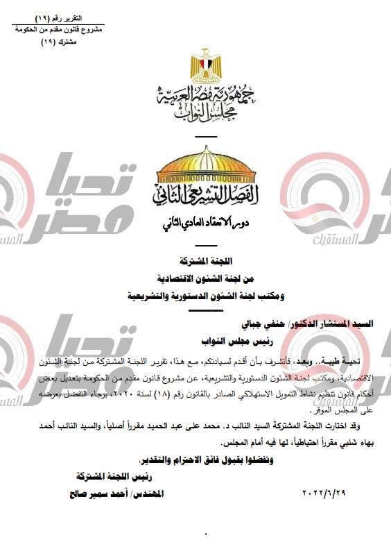 تناقش الجلسة العامة لمجلس النواب برئاسة المستشار الدكتور حنفي جبالي، الأسبوع المقبل، تقرير اللجنة المشتركة من لجنة الشئون الاقتصادية ومكتب لجنة الشئون الدستورية والتشريعية عن مشروع قانون مقدم من الحكومة بتعديل بعض أحكام قانون تنظيم نشاط التمويل الاستهلاكي الصادر بالقانون رقم 18 لسنة ٢٠٢٠ ۲).