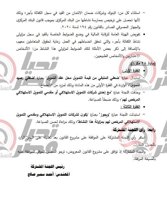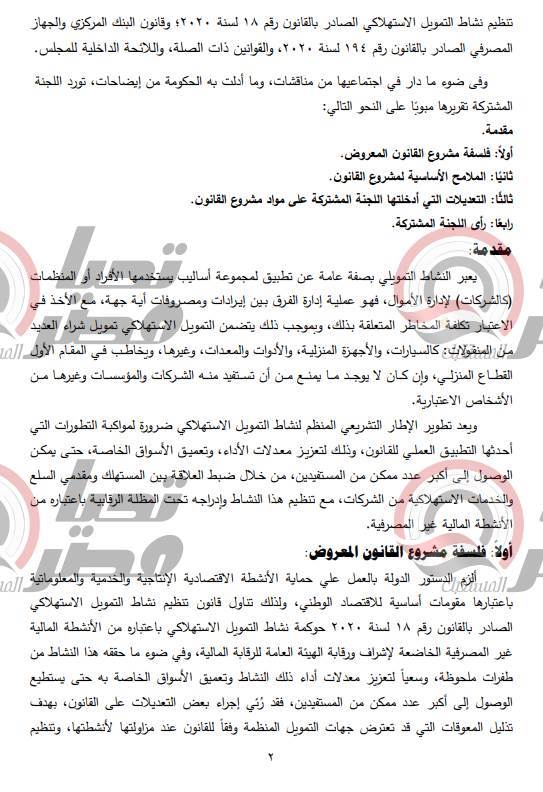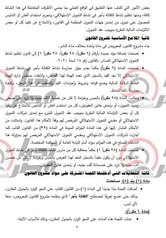 وجاء في المذكرة الإيضاحية لمشروع التعديل، أن قانون تنظيم نشاط التمويل الاستهلاكي الصادر بالقانون رقم 18 لسنة 2020 يهدف إلى حوكمة نشاط التمويل الاستهلاكي باعتباره من الأنشطة المالية غير المصرفية الخاضعة لإشراف ورقابة الهيئة العامة للرقابة المالية، وفي ضوء ما حققه هذا النشاط من طفرات ملحوظة، وسعياً لتعزيز معدلات أداء ذلك النشاط وتعميق الأسواق الخاصة به حتى يستطيع الوصول إلى أكبر عدد ممكن من المستفيدين.