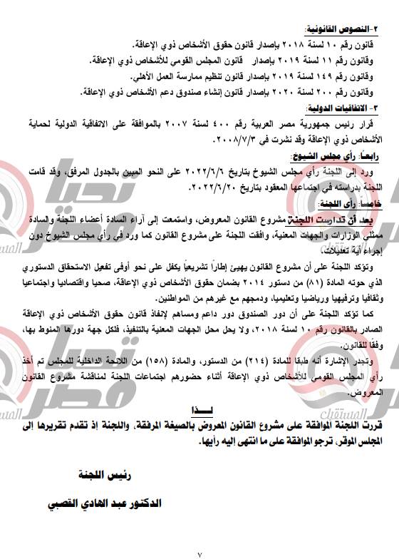 أكد تقرير اللجنة، أن مصر شهدت في الآونة الأخيرة بدايات حقيقية من أجل إرساء قواعد ثابتة لحقوق الأشخاص ذوي الإعاقة، وأكد على ذلك المشرع الدستوري في العديد من المواد وخاصة المادة 81 منه، وأشارت إلي حرص الرئيس عبد الفتاح السيسي منذ توليه رئاسة البلاد على ضمان حقوقهم، بل أكد على أنهم شريك أساسي في الوطن، و حرص على إقامة الفعاليات والاحتفالات تكريما لهم، والعمل علي ضمان الرعاية الصحية والتعليمية وتوفير فرص العمل من أجل المشاركة في المجتمع بشكل لائق وإنساني.