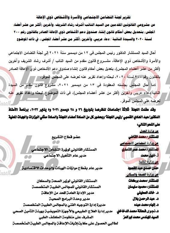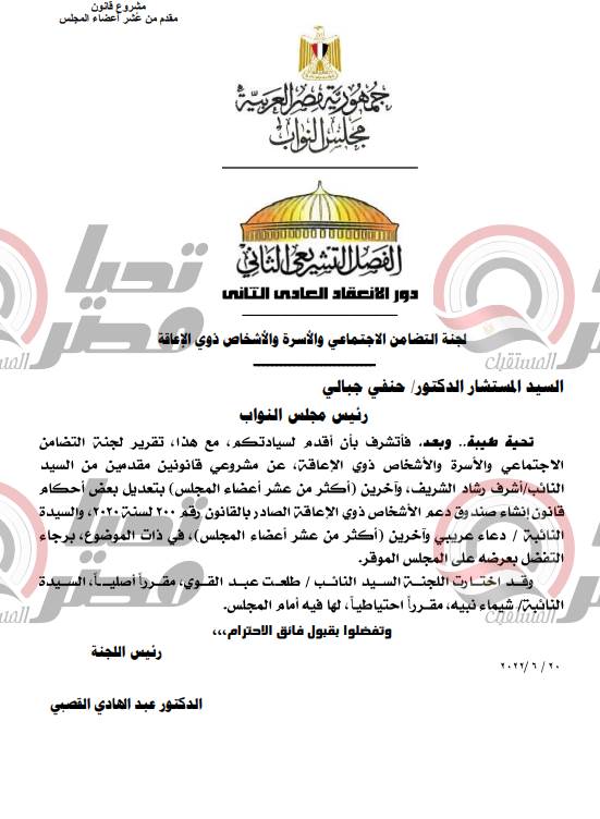 تشهد الجلسة العامة لمجلس النواب برئاسة المستشار الدكتور حنفي جبالي، صباح اليوم، مناقشة تقرير لجنة التضامن الاجتماعي والأسرة والأشخاص ذوي الإعاقة عـن مشـروعي القانونين المقدمين من النائب أشـرف رشـاد الشريف وآخرين (أكثر من عشر عدد أعضاء المجلس)، بتعديل بعض أحكام قانون إنشاء صندوق دعم الأشخاص ذوي الإعاقة الصـادربالقانون رقم 200 لسـنة 2020 ، والنائبة دعاء عريبي وآخرين (أكثر من عشر عدد أعضاء المجلس)، في ذات الموضوع.