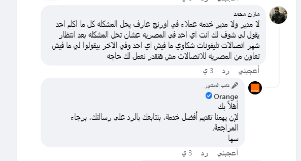 علق عميل اورنج عبر صفحة الشركة الرسمية على موقع "فيسبوك:"، قائلاً: "لا مدير ولا مدير خدمة عملاء في اورنج عارف يحل المشكلة كل ما اكلم احد يقول لي شوف لك انت أي أحد في المصرية عشان تحل المشكلة".