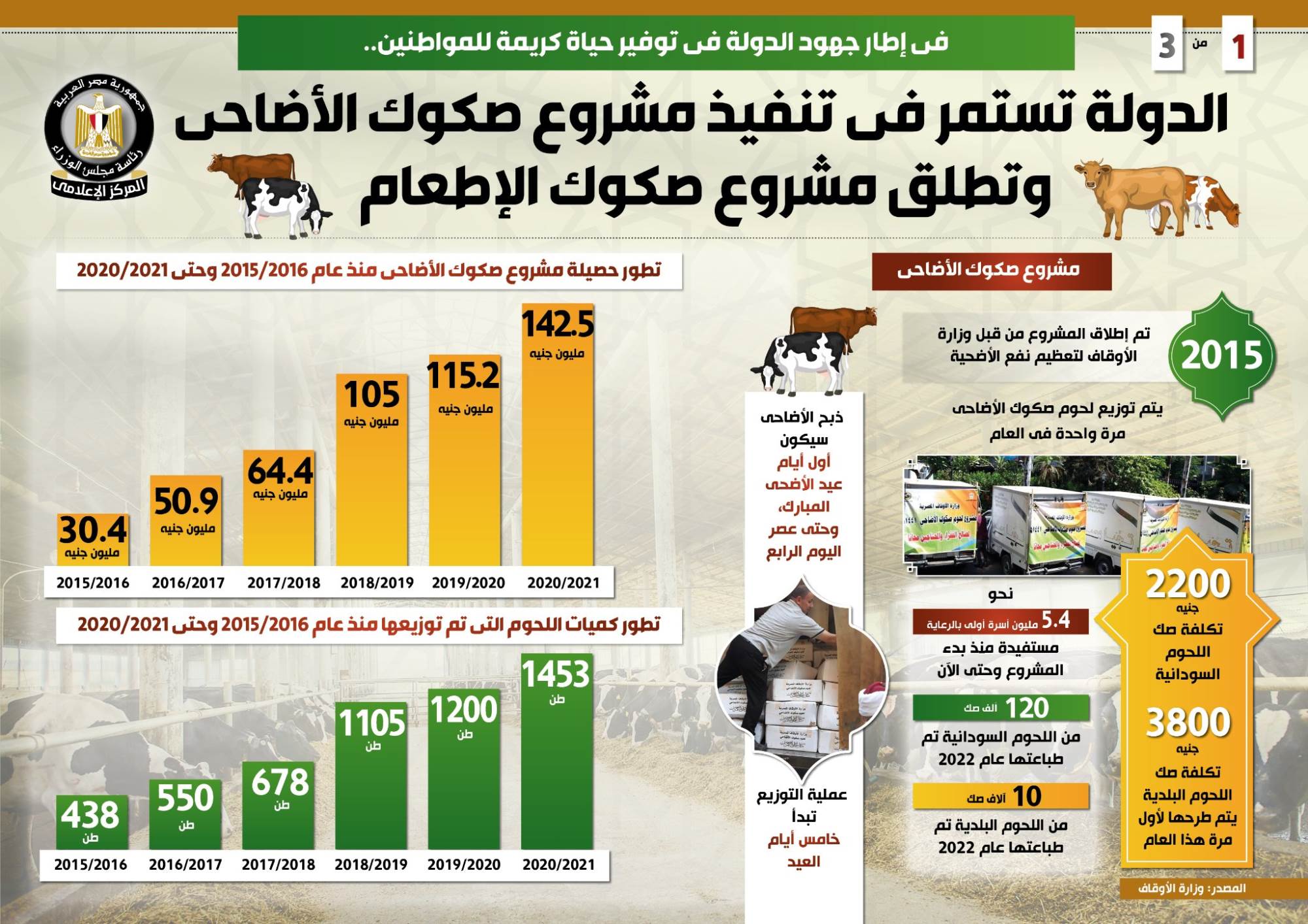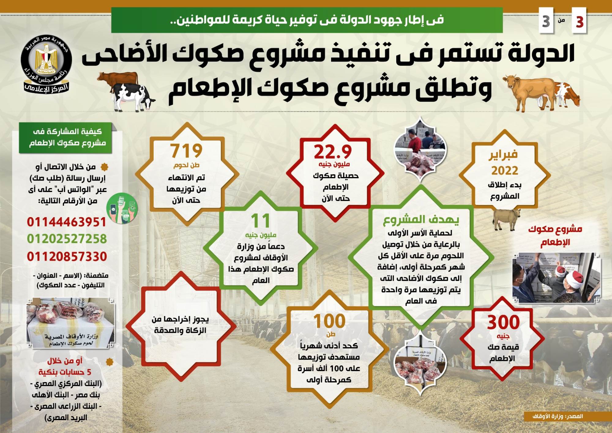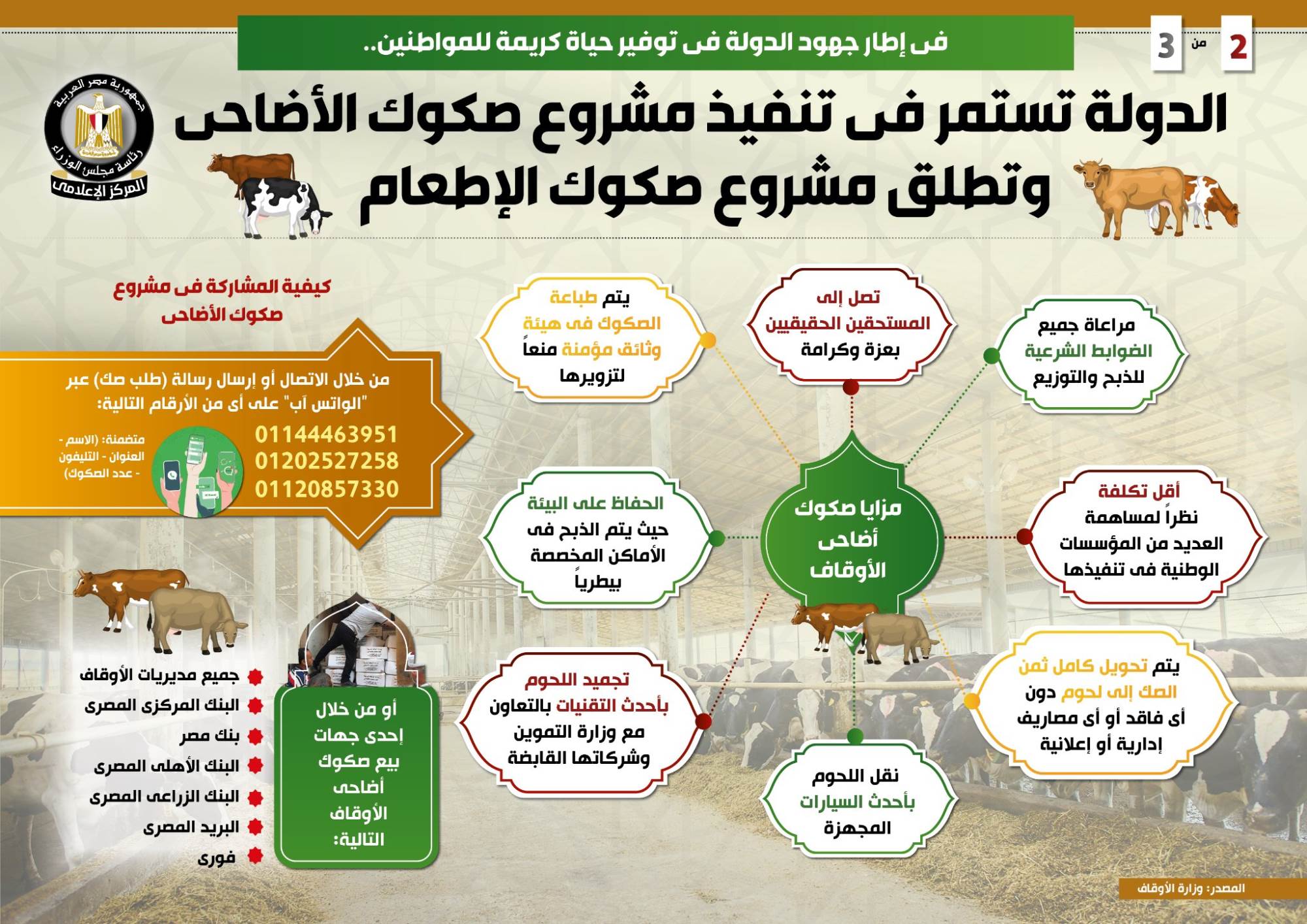 وفي هذا الصدد نشر المركز الإعلامي لمجلس الوزراء تقريراً تضمن انفوجرافات تسلط الضوء على استمرار الدولة في تنفيذ مشروع صكوك الأضاحي، فضلاً عن إطلاقها مشروع صكوك الإطعام، وذلك في إطار جهودها في توفير حياة كريمة للمواطنين.