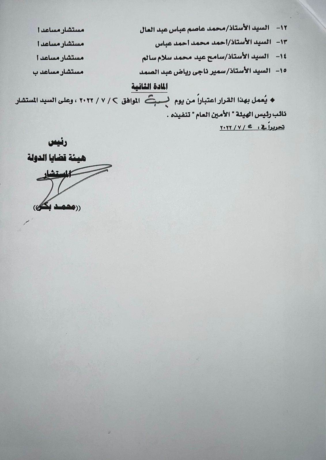 وكان قد أصدر رئيس الهيئة قرارا أول أمس بندب المستشار أحمد فكري صالح بسيوني نائب رئيس الهيئة أمينًا عاما للهيئة.
