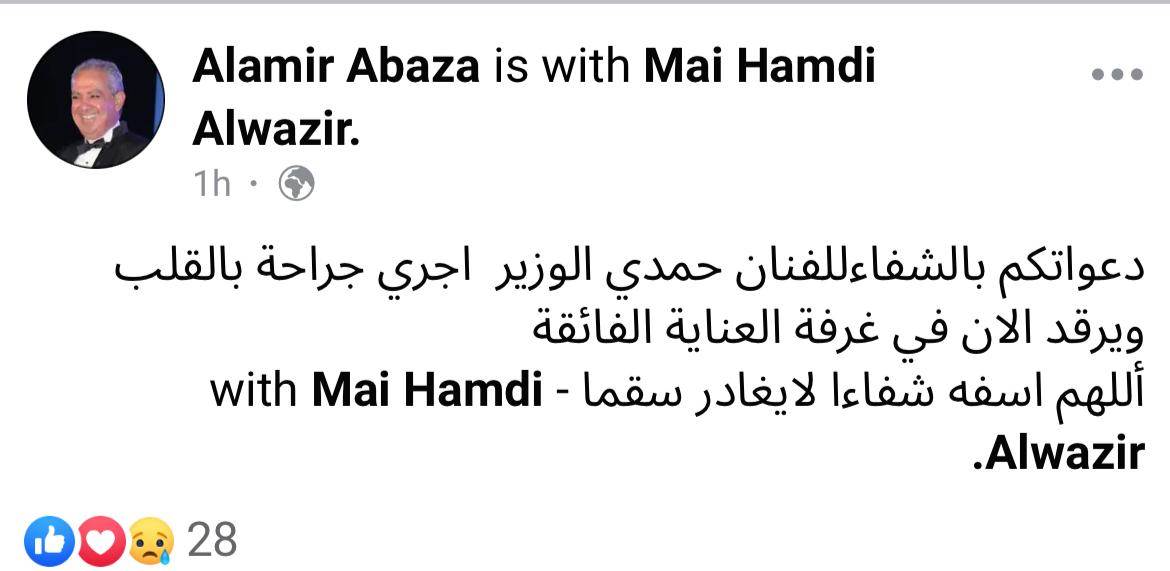 وكتب الأمير أباظة عبر حسابه الرسمي بموقع التواصل الإجتماعي “فيسبوك” مطالبا الجمهور الدعاء لـ حمدي الوزير: “دعواتكم بالشفاءللفنان حمدي الوزير اجري جراحة بالقلب ويرقد الان في غرفة العناية الفائقة، اللهم اسفه شفاءا لايغادر سقما”.