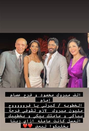 وعلق الفنان تامر حسني على صور الخطوبة قائلًا: “ألف مبروك محمود وفرح عصام إمام الخطوبة، كبرتي يا فروحة مليون مبروك، لازم تشوفي فرحة بباكي ومامتك بيكي وبخطيبك العسل كانت عامله إزاي ربنا يخليكوا لبعض”.
