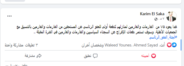 وأضاف عضو لجنة العفو الرئاسي، على حسابه الشخصي على موقع التواصل الاجتماعي فيسبوك،” غدا يعود ٧٥ من الغارمات والغارمين لمنازلهم كدفعة أولى للعفو الرئاسي عن المستحقين من الغارمات والغارمين بالتنسيق مع الجمعيات الأهلية، وسوف تستمر دفعات الإفراج عن السجناء السياسيين والغارمات والغارمين في الفترة المقبلة”.