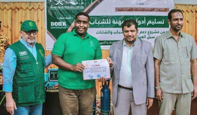 وَزَّعَ مركزُ الملكِ سلمانَ للإغاثة والأعمال الإنسانية أدواتِ المهنة لـ125 شابًا ضمن مشروع دعم تمكين الشباب والشابات لتحسين سبل العيش بمحافظة المهرة.