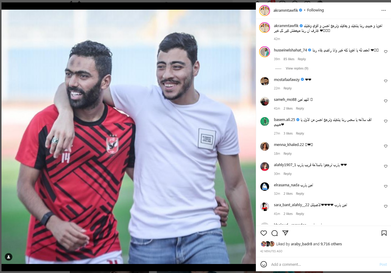 وكتب أكرم توفيق عبر حسابة الرسمي" انستجرام":" اخويا و حبيبي ربنا يشفيك و يعافيك وترجع احسن و اقوي وخليك عارف ان ربنا مبيعملش غير كل خير.