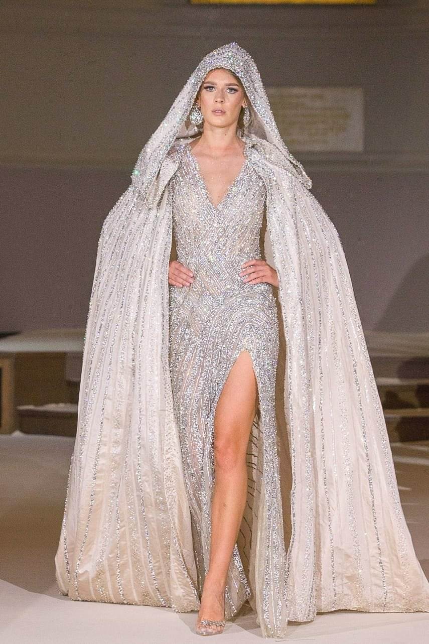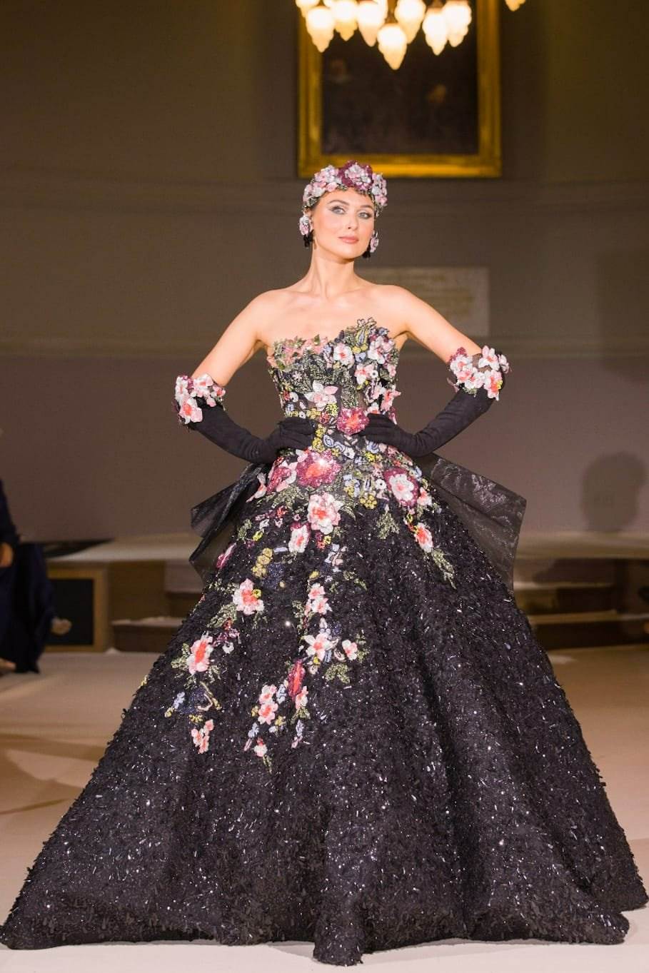 تنوعت تصميمات هاني البحيري بين الفساتين ذات الطابع الملكي والمرصعة باللون الذهبي، وذلك في أسبوع الموضة الفرنسي لـ شتاء وخريف 2023.