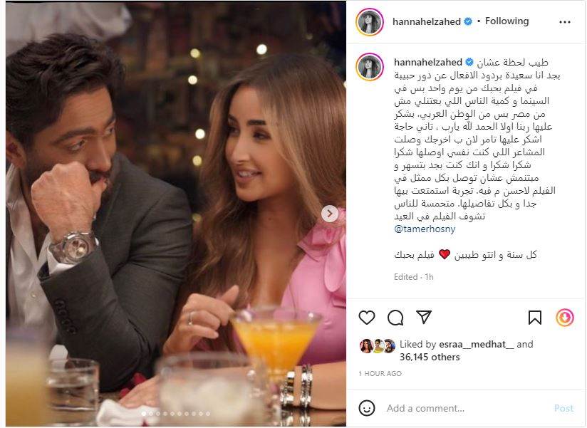 ومن جانبه رد الفنان تامر حسنى على كلامها من خلال خاصية التعليقات قائلة: "يا هنا مليون مبروك نجاحك أنا شوفته بعين جديدة العين اللي وعدتك بيها ودلوقتي ربنا بيجازينا كل خير مش بس عشان تقدم إيرادنا في مصر والوطن العربي”.