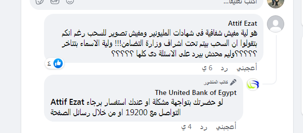 علقت عميلة بنك المصرف المتحد عبر صفحته الرسمية على موقع "فيسبوك"،: "هو ليه مفيش شفافية فى شهادات المليونير ومفيش تصوير للسحب رغم إنكم بتقولوا أن السحب بيتم تحت إشراف وزارة التضامن".
