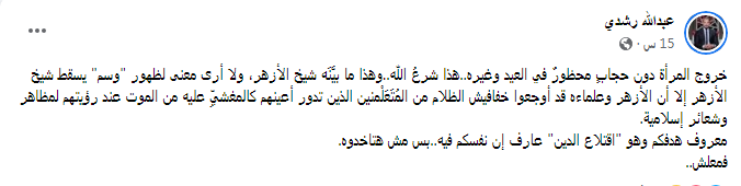 وكتب «رشدي»، عبر صفحته على فيس بوك:«خروج المرأة دون حجابٍ محظورٌ في العيد وغيره..هذا شرعُ الله..وهذا ما بيَّنَه شيخ الأزهر».