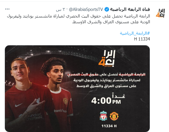 أعلنت قناة الرابعة الرياضية الحصول على حقوق بث مباراة ليفربول ومانشستريونايتد الودية ، والتي من المقرر إقامتها في تمام الساعة الثالثة عصراً غد، الثلاثاء، على مستوى العراق والشرق الأوسط.