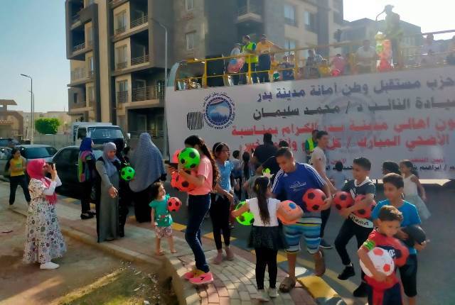 نظمت أمانة مدينة بدر، إحتفالية أول أيام "عيد الأضحى" المبارك؛ لتوزيع "7 ألف هدية" عينيه بخلاف توزيع "كوبونات للملاهى" على جميع الأطفال فى معظم أحياء مدينة بدر بعد صلاة "عيد الأضحى" مباشرةً فى جميع مساجد داخل الأحياء، وشكلت الأمانة مجموعات من الشباب بكافة مساجد أحياء المدينة؛ لتوزيع ألآف الهدايا المتنوعة وكوبونات الملاهى والبالونات، على صغار الأطفال أثناء خروجهم من الصلاة، حيث تم المرور على جميع الأحياء فى المدينة بدون إستثناء بسيارات الحزب؛ نظراً للكثافة السكانية العالية وحتى نستطيع أن نصل لكل أطفال المدينة.