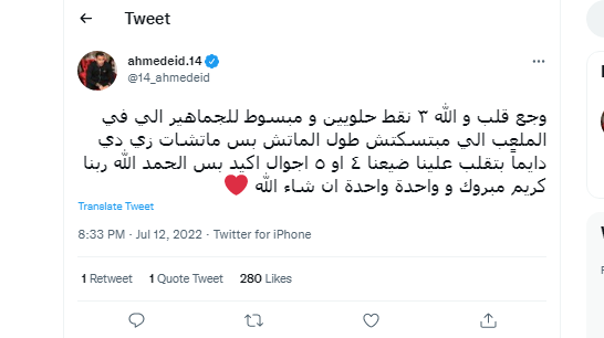 وغرد أحمد عيد عبد الملك من خلال حسابه على موقع التواصل الاجتماعي الخاص بالتدوينات القصيرة “تويتر” معلقا على فوز الزمالك قائلا: “وجع قلب و الله ٣ نقط حلويين و مبسوط للجماهير الي في الملعب الي مبتسكتش طول الماتش”.