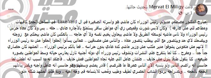 وتابعت: "المشهد كان حضاري جداً جداً .. ومفرح .. كنا لما بنتفرج علي النشرات ونشوف رئيس وزراء أي دوله أجنبيه نازل يمارس حياته وسط المواطنين بصوره طبيعيه .. كنا بنقول طبعًا ينزل مش خايف .. علشان عامل اللي عليه تجاه المواطنين فمش خايف .. فأعتقد انه ده السبب انه اطمئن لما حاسس انه راضي الناس ولو بنسبه (لان الناس عمرها ما هترضي ) قادر يمشي وسطهم وهو حاسس انه عامل واجبه ويقدر يبادلهم الحجه بالحجه .. وبصراحه بردوا الشعب المصري لطيف وطيب ومُحب للابتسامه في وجه اخيه .. وده خلي المشهد شكله حلو..".