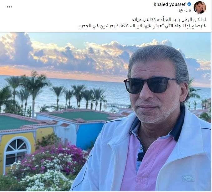 وكتب خالد يوسف عبر فيسبوك: “إذا كان الرجل يريد المرأة ملاكًا في حياته، فليصنع لها الجنة التي تعيش فيها، لأن الملائكة لا يعيشون في الجحيم”.