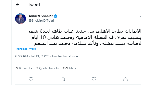 وغرد “شوبير” قائلا: “الإصابات تطارد الاهلي من جديد غياب طاهر لمدة شهر بسبب تمزق ف العضلة الأمامية ومحمد هاني 10 أيام لإصابته بشد عضلي وتأكد سلامة محمد عبد المنعم”.
