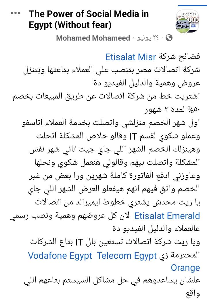 نشر عميل اتصالات مصر عبر صفحته الشخصية على موقع "فيسبوك" وبأحد المجموعات الافتراضية، قائلاً :"فضائح شركة Etisalat Misr شركة اتصالات مصر بتنصب على العملاء بتاعتها وبتنزل عروض وهمية".