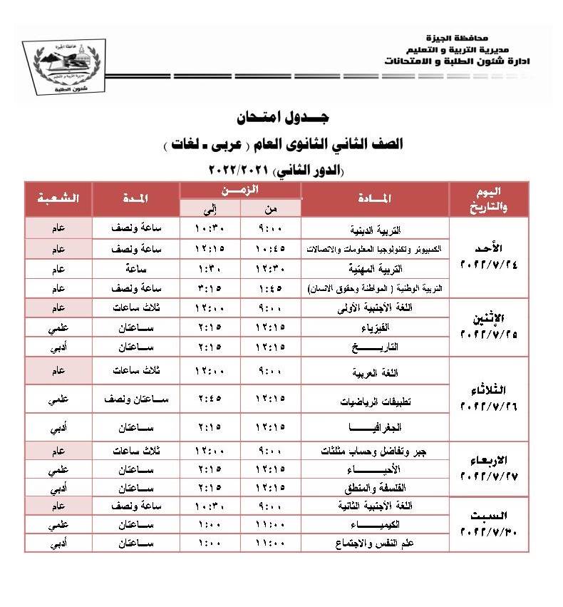 حدد أشرف سلومة وكيل وزارة التربية والتعليم والتعليم الفني بمحافظة الجيزة، جداول مواعيد امتحانات الدور الثاني لجميع الطلاب بصفوف النقل بالمراحل التعليمية المختلفة للعام الدراسي 2022/2021.