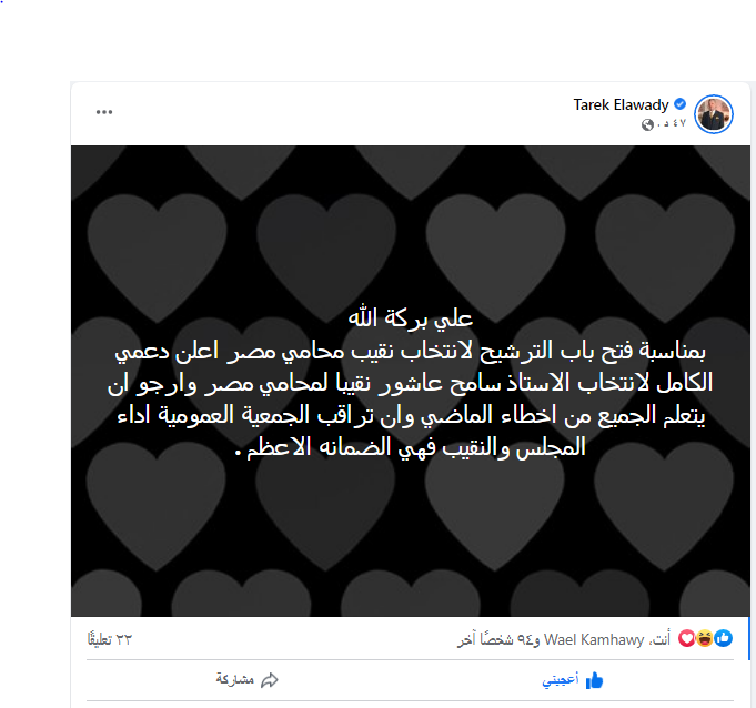 وأضاف العوضي على حسابه الشخصي على موقع التواصل الاجتماعي فيس بوك، “ علي بركة الله بمناسبة فتح باب الترشيح لانتخاب نقيب محامي مصر، اعلن دعمي الكامل لانتخاب الاستاذ سامح عاشور نقيبا لمحامي مصر “.
