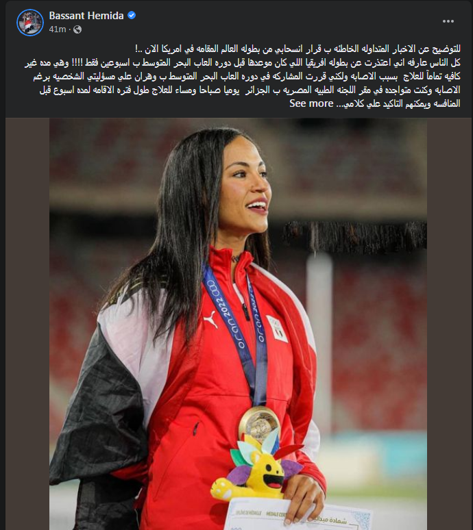 وتابع:"كل الناس عارفه اني اعتذرت عن بطوله افريقيا اللي كان موعدها قبل دوره العاب البحر المتوسط ب اسبوعين فقط وهي مده غير كافيه تمامآ للعلاج بسبب الاصابه ولكني قررت المشاركه في دوره العاب البحر المتوسط ب وهران علي مسؤليتي الشخصيه برغم الاصابه وكنت متواجده في مقر اللجنه الطبيه المصريه ب الجزائر.