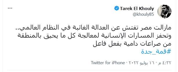 النائب طارق الخولي عن قمة جدة: «مازالت مصر تفتش عن العدالة الغائبة في النظام العالمي»