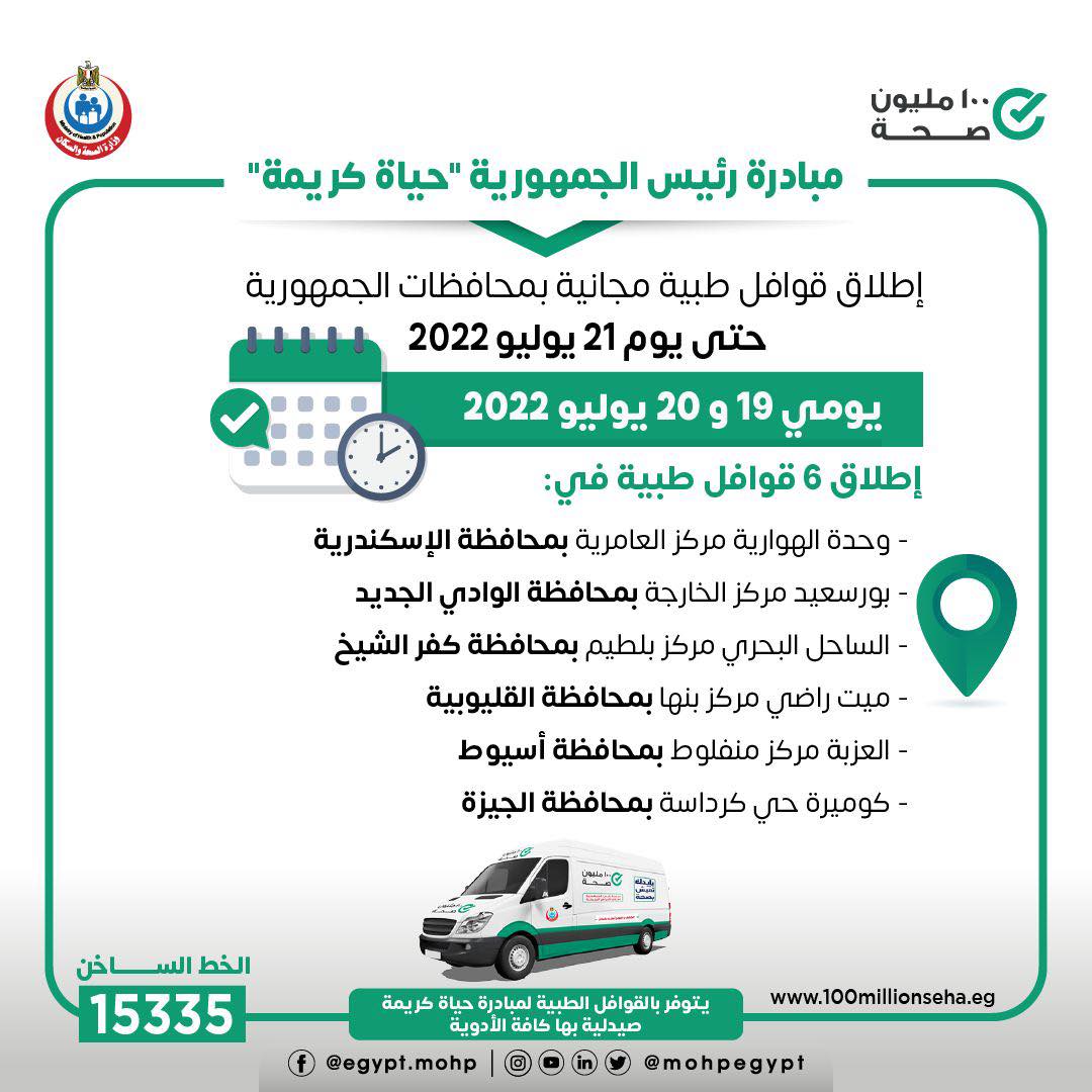 وأوضحت وزارة الصحة والسكان، في منشور لها على صفحتها الرسمية على موقع التواصل الاجتماعي «فيس بوك»، أن القوافل الطبية ستتواجد في 6 محافظات هما :« القليوبية - الجيزة - الإسكندرية - كفر الشيخ - أسيوط - الوادي الجديد»، على مدار يومي 19 و20 يوليو 2022،للكشف والعلاج المجاني تحت شعار «100 مليون صحة»، مع أخذ كافة الاحتياطات والاحترازات اللازمة لمواجهة فيروس كورونا.