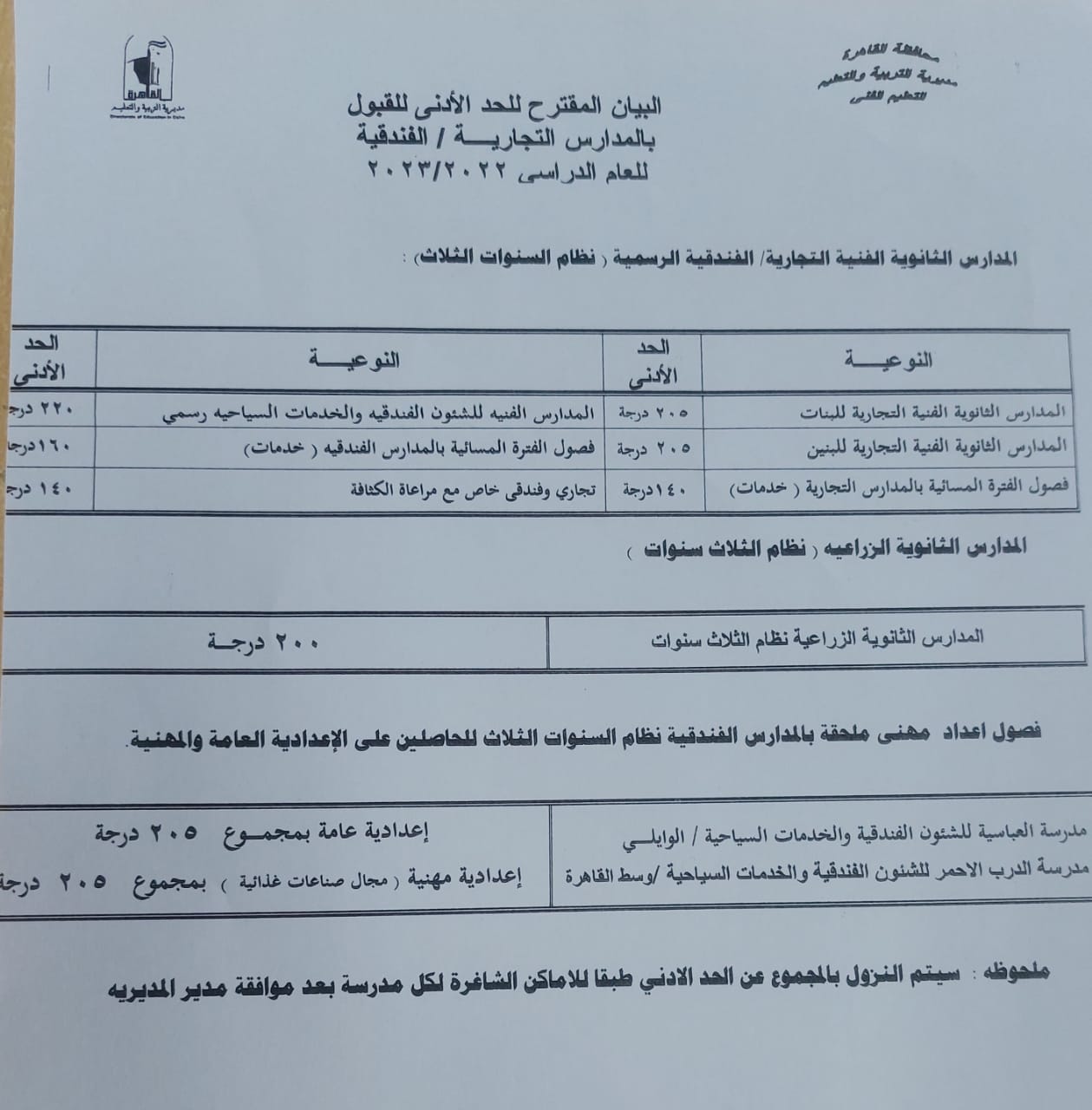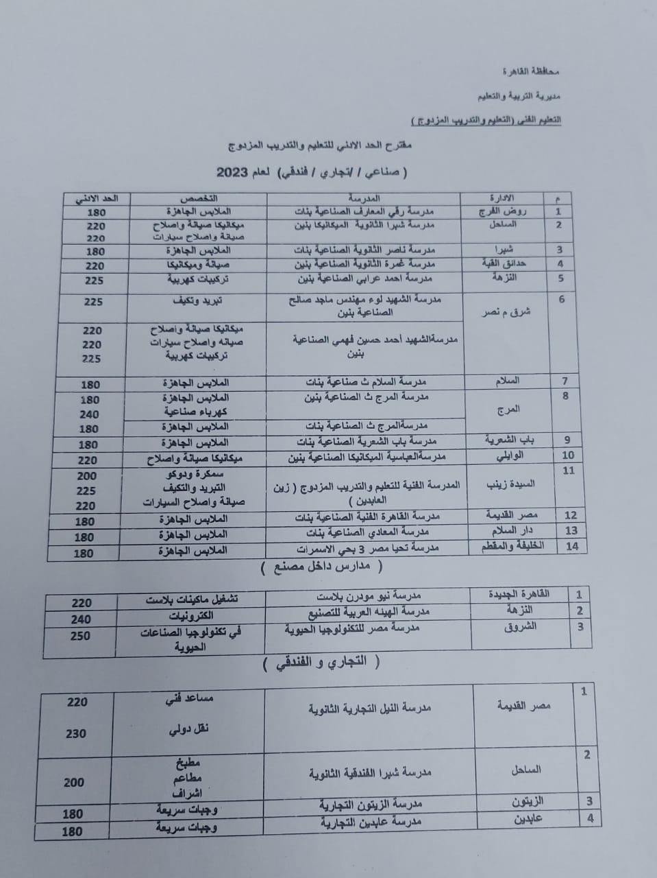ووأشارت مديرية التربية والتعليم بالقهرة، إلى أنه مرفق جدول مقترح للحد الأدنى للقبول بالمدارس الثانوية الفنية للعام الدراسى 2022 /2023، وذلك على النحو التالي