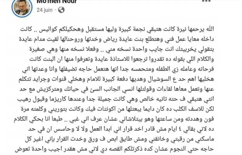 كتب مؤمن نور غير حسابه الرسمي بموقع التواصل الاجتماعي فيسبوك، ساردا الكواليس: «الله يرحمها نبرة كانت هتبقى نجمة كبيرة وليها مستقبل وهحكيلكم كواليس .. كانت داخله معايا عمل فني وهتطلع بنت عايدة رياض وخدتها وروحنالها لقيت مدام عايدة بتقولي يخربيتك انت جايب واحدة نسخة مني».
