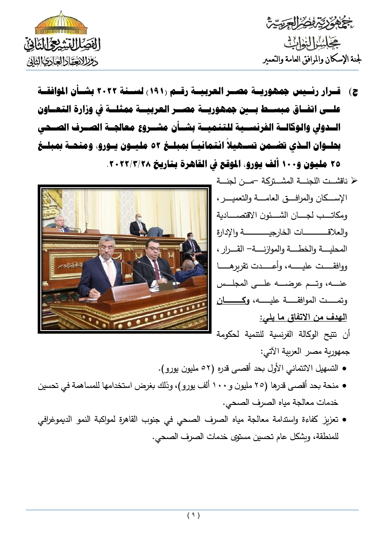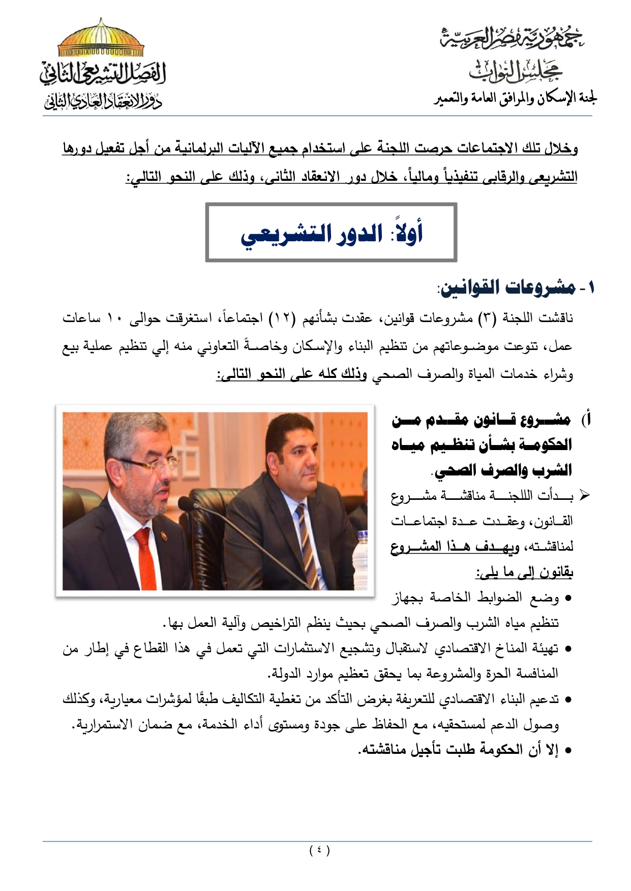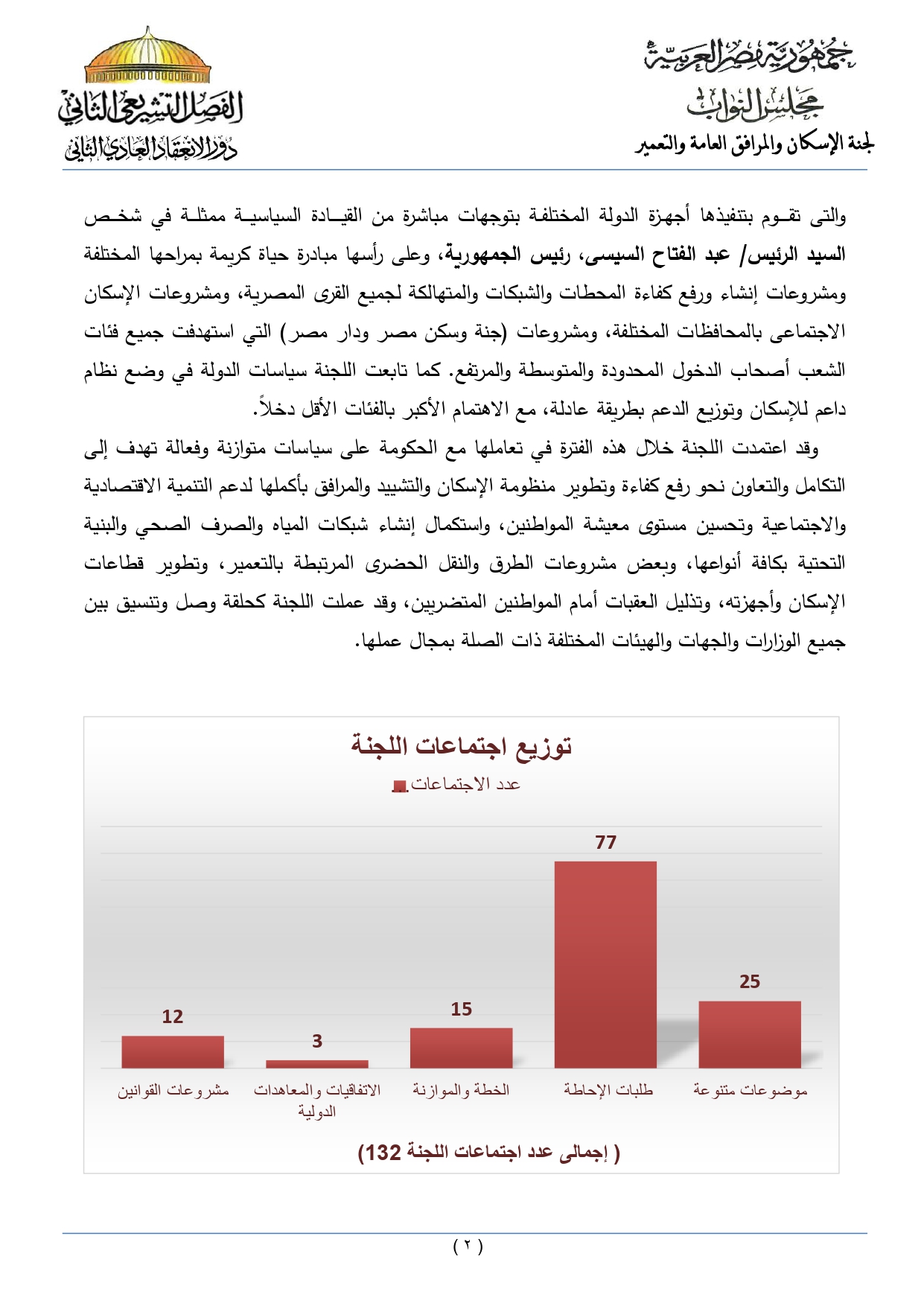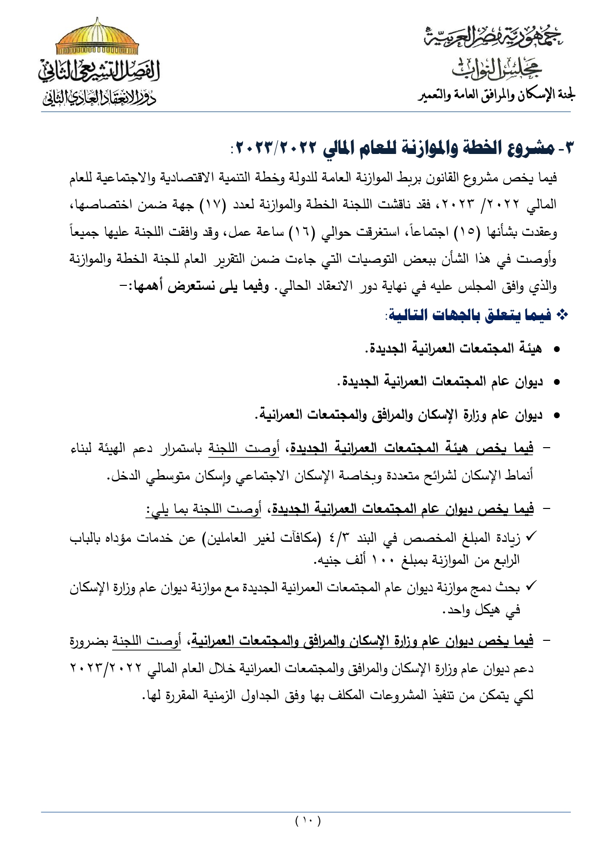 وأقرت عدداً من الاتفاقيات الدولية المتعلقة بمنح وقروض لتمويل تطوير مشروعات الإسكان والمرافق والنقل الحضري المختلفة، وذلك بخلاف تطرفها لعدد كبير من الموضوعات والمشكلات المتعلقة بكافة القطاعات المتعلقة بوزارة الإسكان من خلال مناقشتها لمنـات الموضوعات الواردة بطلبات الإحاطة المحالة إليها.
