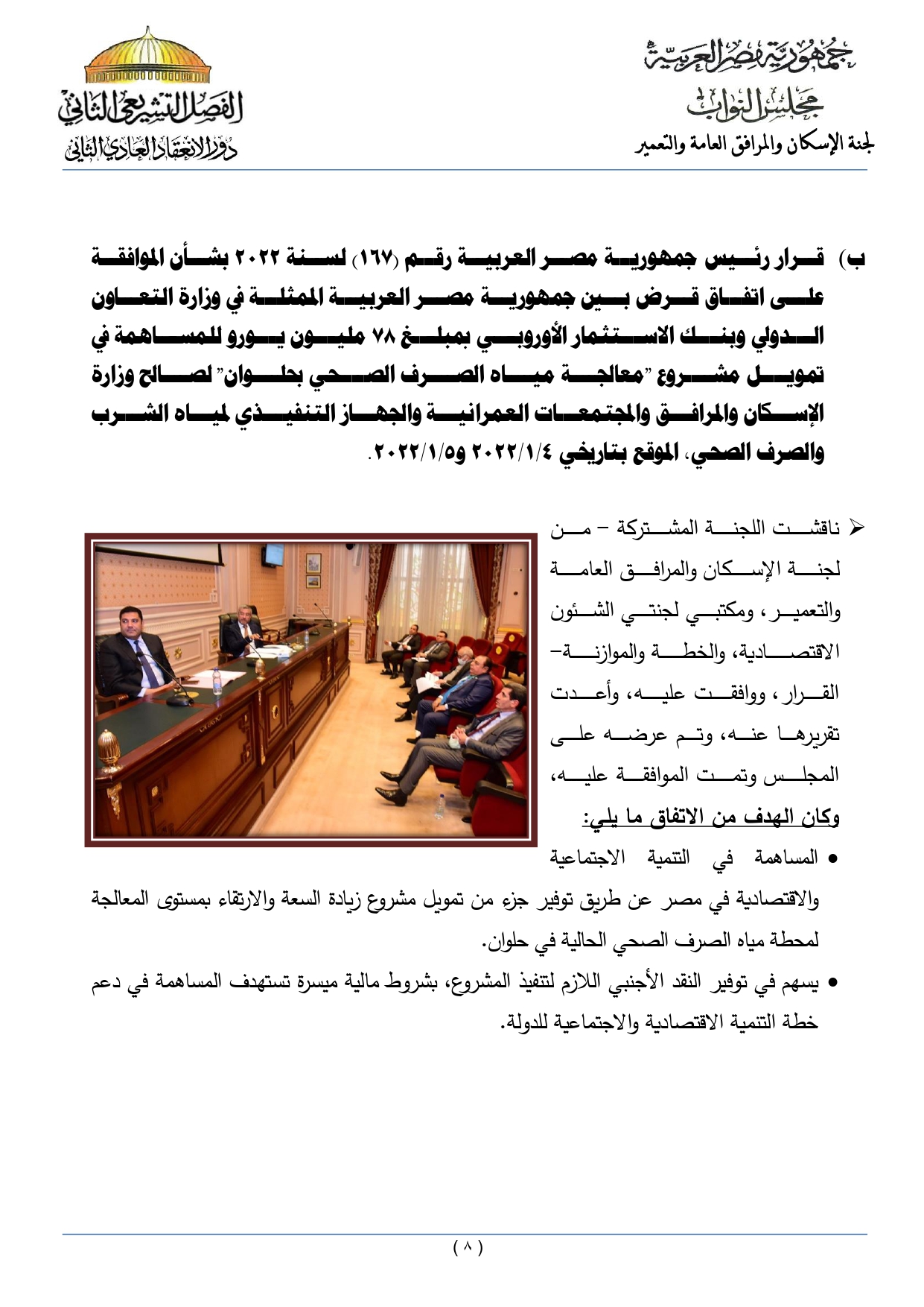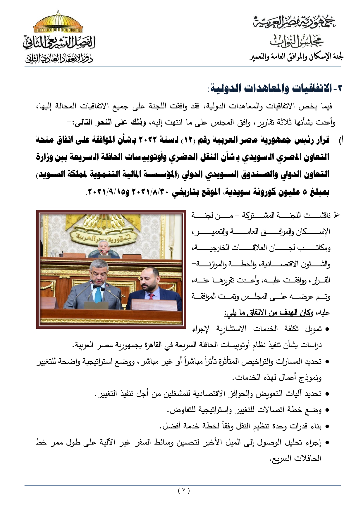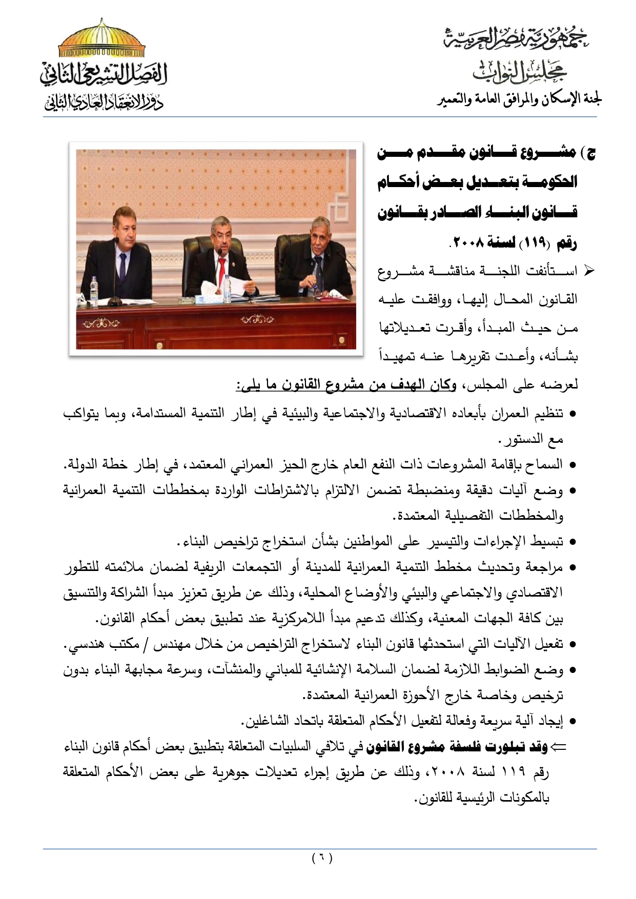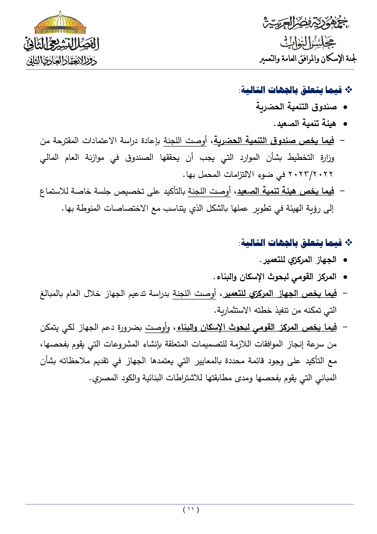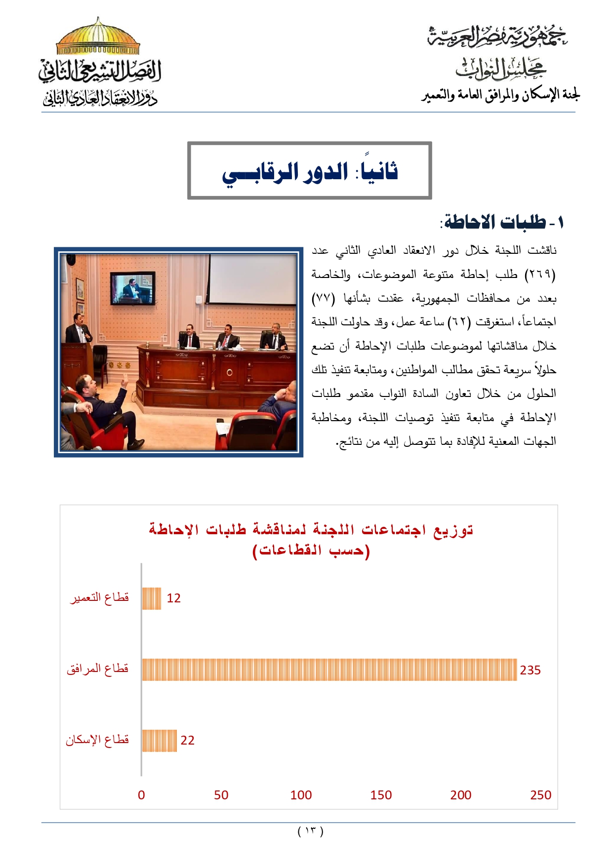 وأقرت عدداً من الاتفاقيات الدولية المتعلقة بمنح وقروض لتمويل تطوير مشروعات الإسكان والمرافق والنقل الحضري المختلفة، وذلك بخلاف تطرفها لعدد كبير من الموضوعات والمشكلات المتعلقة بكافة القطاعات المتعلقة بوزارة الإسكان من خلال مناقشتها لمنـات الموضوعات الواردة بطلبات الإحاطة المحالة إليها.