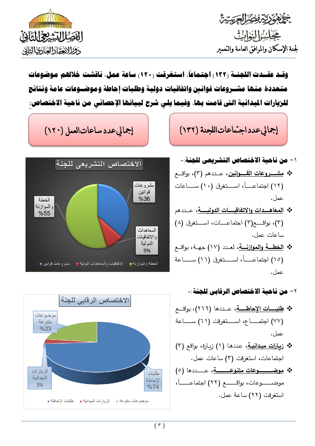 وقد عقدت اللجنة 132 اجتماعا استغرقت 120 ساعة عمل ناقشت خلالهم موضوعات متعددة منها مشروعات قوانين واتفاقيات دولية وطلبات إحاطة وموضوعات عامة ونتائج للزيارات الميدانية التى قامت بها حيث من ناحية الاختصاص التشريعى للجنة تضمنت مشروعات 3 بواقع 12 اجتماعا استغرق 10 ساعات والمعاهدات الدولية عددهم 3 وإقرار الخطة والموازنة لعدد 17جهة، ومن ناحية الاختصاص الرقابى تم نظر 269 طلب إحاطة بواقع 77اجتماع استغرقت 61 ساعة عمل وعدد 1زيارة ميدانية بجانب نظر عدة موضوعات متنوعة.
