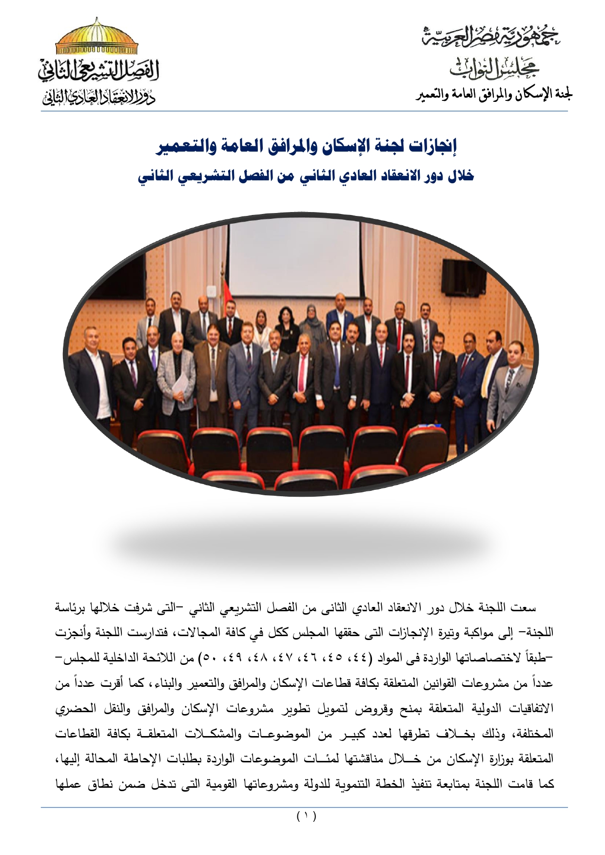 ينشر موقع تحيا مصر إنجازات لجنة الإسكان والمرافق بمجلس النواب برئاسة النائب عماد سعد حمودة، خلال دور الانعقاد الثانى للبرلمان، حيث سعت اللجنة لمواكبة وتيرة الإنجازات التي حققها المجلس ككل في كافة المجالات، فندارست اللجنة وأنجزت طبقاً لاختصاصاتها الواردة في المواد (44، 45، 46، 17، 18، 19، 50) من اللائحة الداخلية للمجلس - عدداً من مشروعات القوانين المتعلقة بكافة قطاعات الإسكان والمرافق والتعمير والبناء.