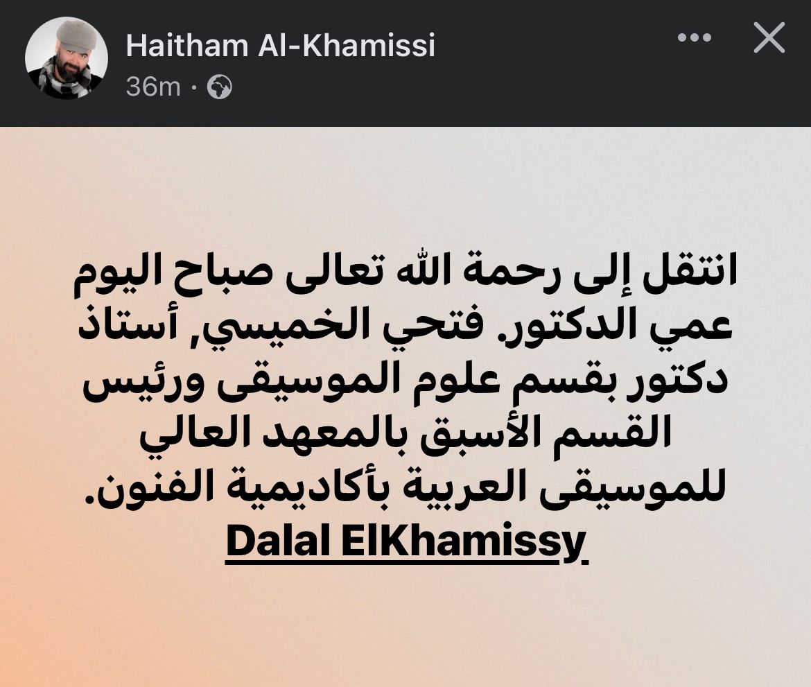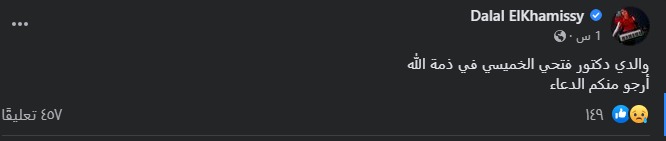 وكتبت دلال الخميسي نجلة الموسيقار الراحل فتحي الخميسي عن وفاة والدها عبر حسابها الرسمي بموقع التواصل الإجتماعي فيسبوك: “والدي دكتور فتحي الخميسي في ذمة الله، أرجو منكم الدعاء”.
