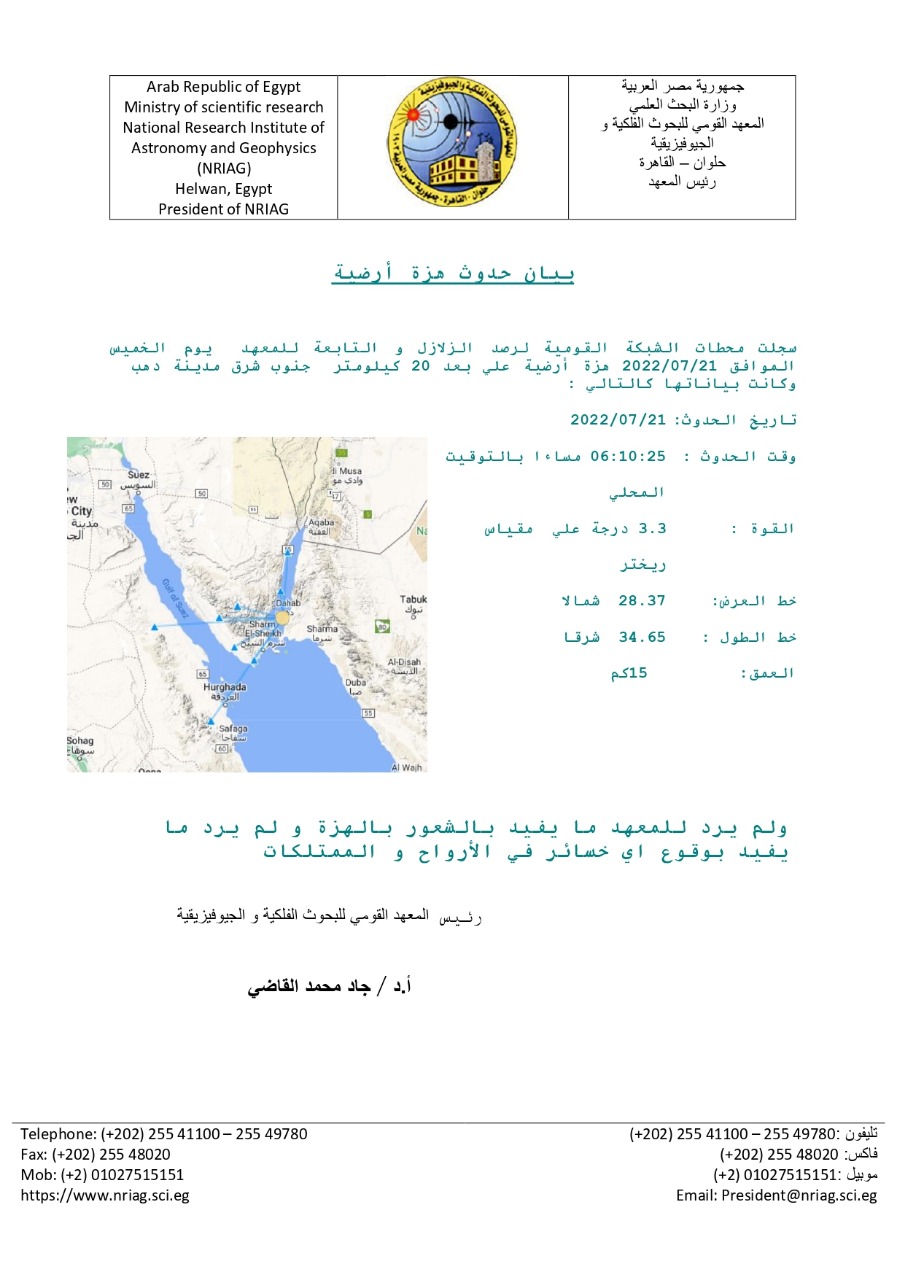 سجلت محطات الشبكة القومية لرصد الزلازل والتابعة للمعهد اليوم الخميس هزة أرضية على بعد 20 کیلومتر جنوب شرق مدينة دهب. وكشف المعهد أن تفاصيل الهزة الأرضية جاءت وقت 06:10:25 مساءا بالتوقيت المحلي والقوة : 3.3 درجة على مقياس ريختر وخط العرض : 28،37 شمالا خط الطول : 34.65 شرقا العمق : 15 كم ولم يرد للمعهد ما يفيد بالشعور بالهزة و لم يرد ما يفيد بوقوع أى خسائر في الأرواح و الممتلكات.