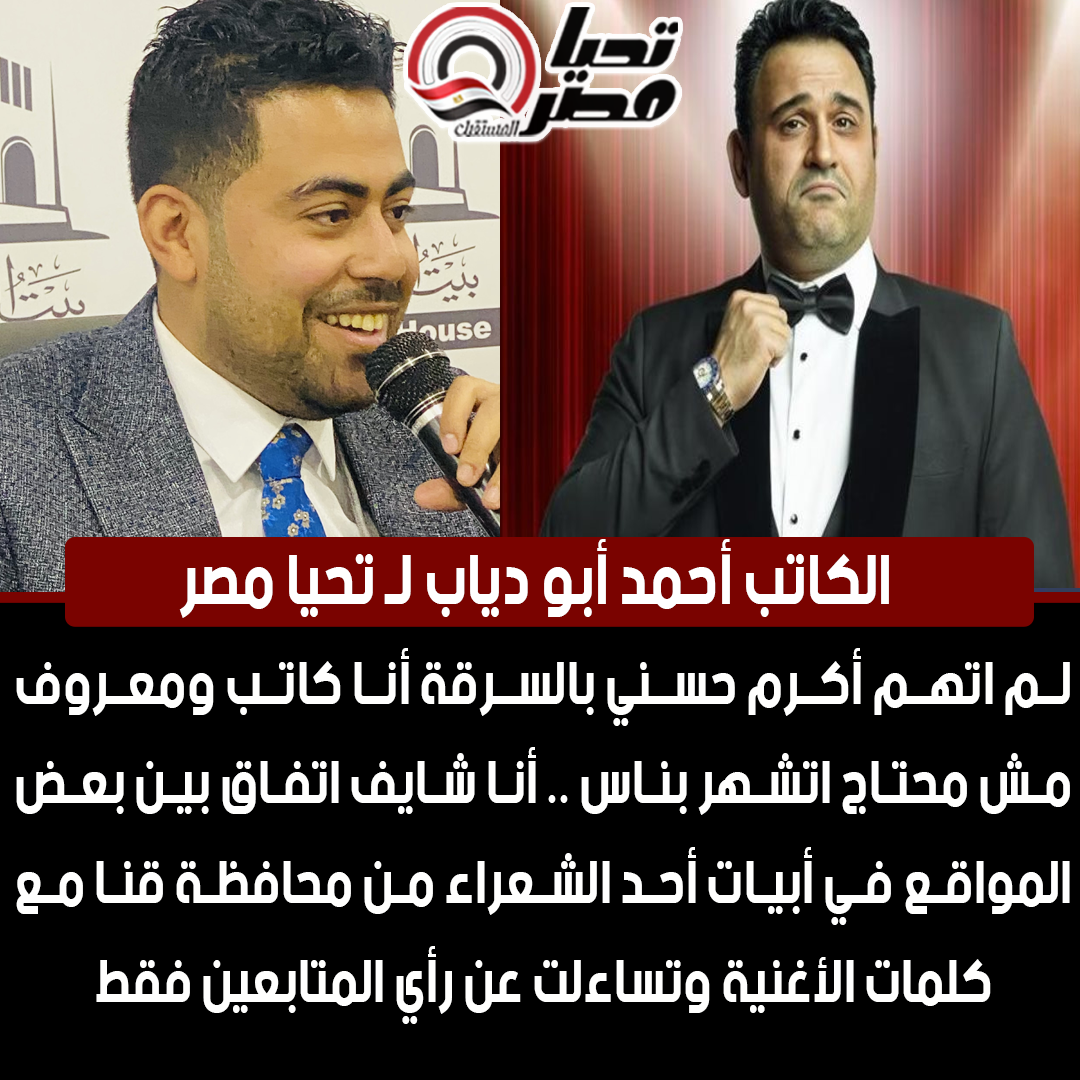 قال الكاتب أحمد أبو دياب في تصريح خاص لـ تحيا مصر: “لم اتهم أكرم حسني بالسرقة أنا كاتب ومعروف مش محتاج اتشهر بناس .. أنا شايف اتفاق بين بعض المواقع في أبيات أحد الشعراء من محافظة قنا وهو الشاعر عادل صابر”.