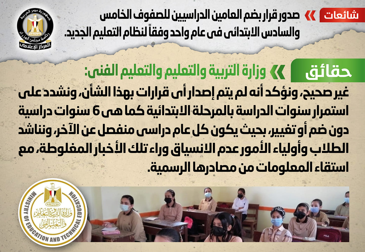 و قام المركز الإعلامي لمجلس الوزراء بالتواصل مع وزارة التربية والتعليم والتعليم الفني، والتي نفت تلك الأنباء، مُؤكدةً أنه لا صحة لضم العامين الدراسيين للصفوف الخامس والسادس الابتدائي في عام واحد وفقاً لنظام التعليم الجديد، وأنه لم يتم إصدار أي قرارات بهذا الشأن.