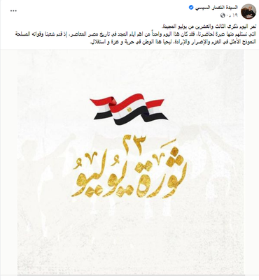 وكتبت قرينة الرئيس: «تمر اليوم ذكرى الثالث والعشرين من يوليو المجيدة، التي نستلهم منها عبرة لحاضرنا، فقد كان هذا اليوم واحداً من اهم أيام المجد في تاريخ مصر المعاصر، إذ قدم شعبنا وقواته المسلحة النموذج الأمثل في العزم والإصرار والإرادة، ليحيا هذا الوطن في حرية و عزة و استقلال".