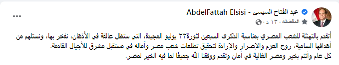 وكتب الرئيس السيسي، على صفحته على موقع التواصل الاجتماعي "فيس بوك": " أتقدم بالتهنئة للشعب المصري بمناسبة الذكرى السبعين لثورة٢٣ يوليو المجيدة التي ستظل عالقة في الأذهان، نفخر بها، ونستلهم من أهدافها السامية، روح العزم والإصرار والإرادة لتحقيق تطلعات شعب مصر وآماله في مستقبل مشرق للأجيال القادمة".